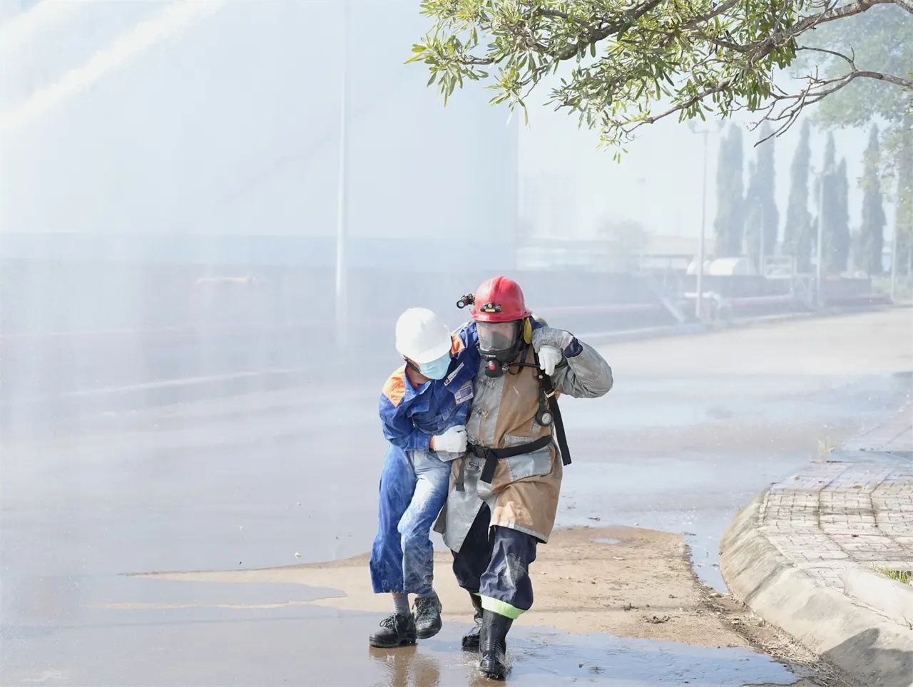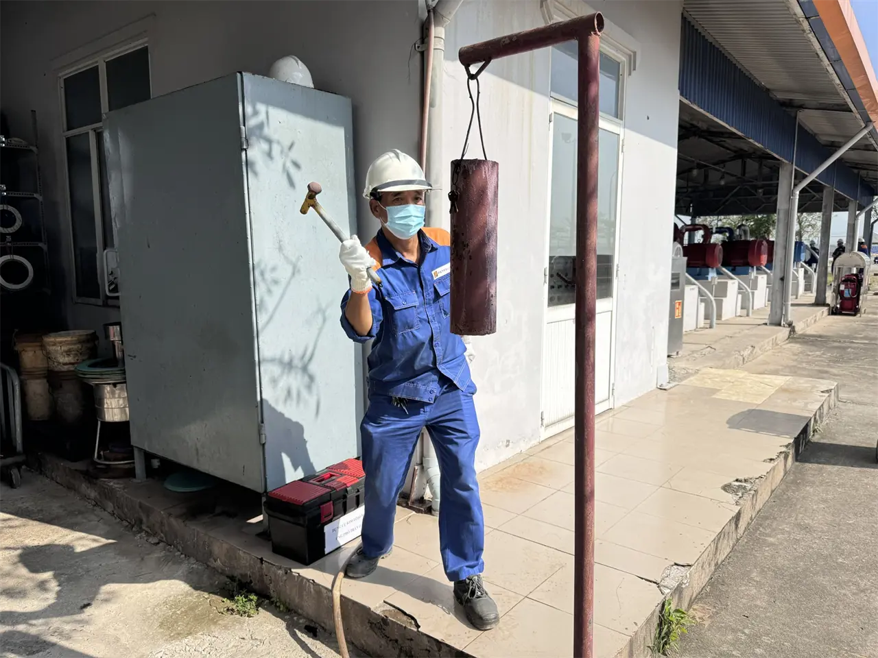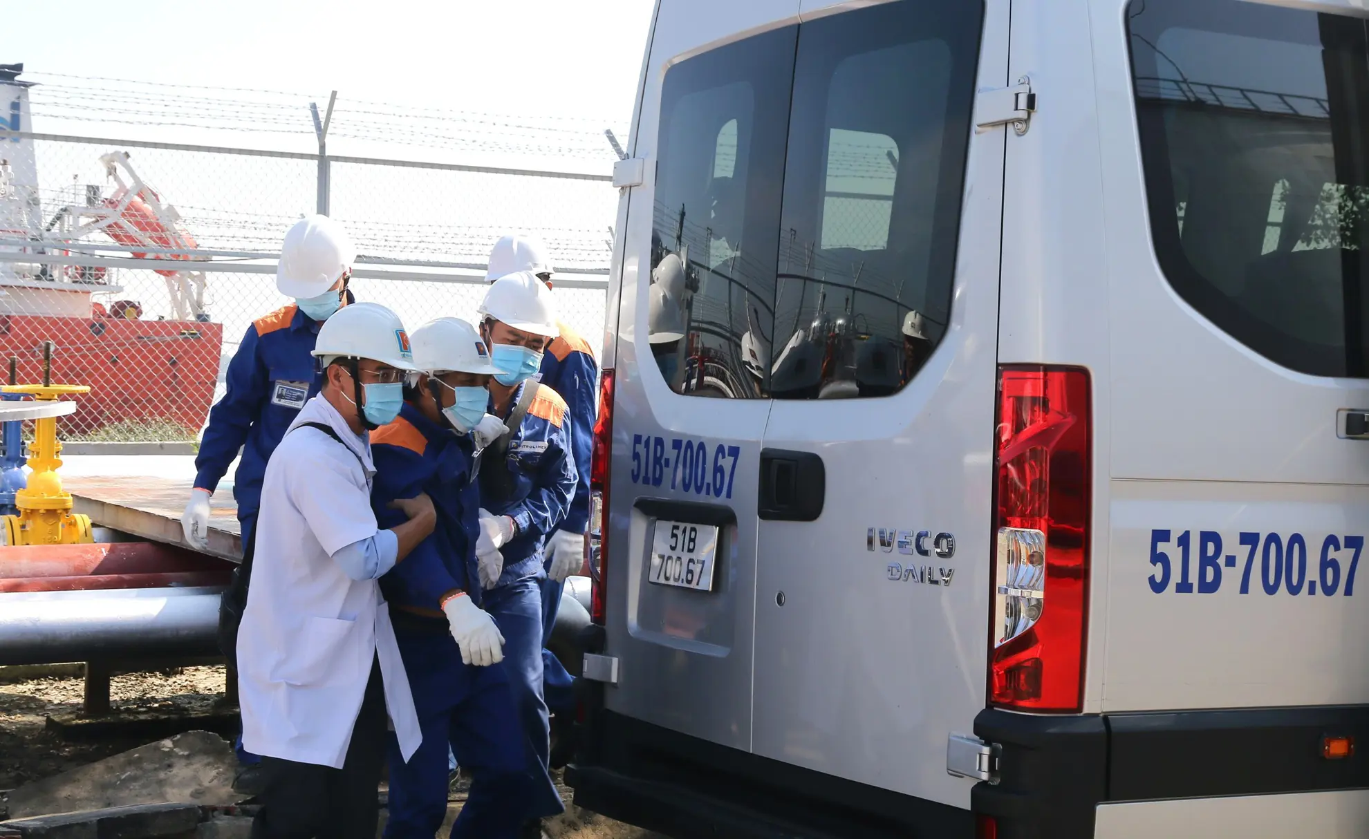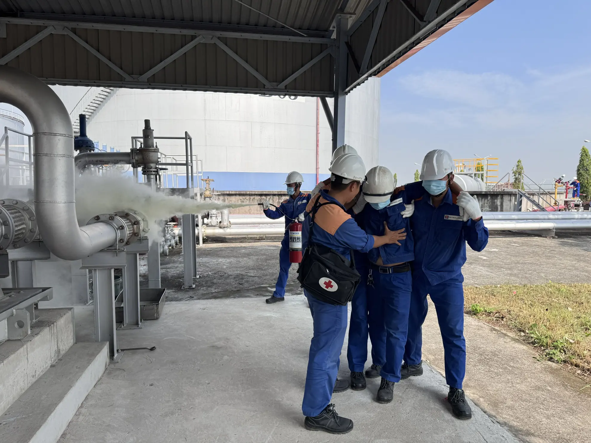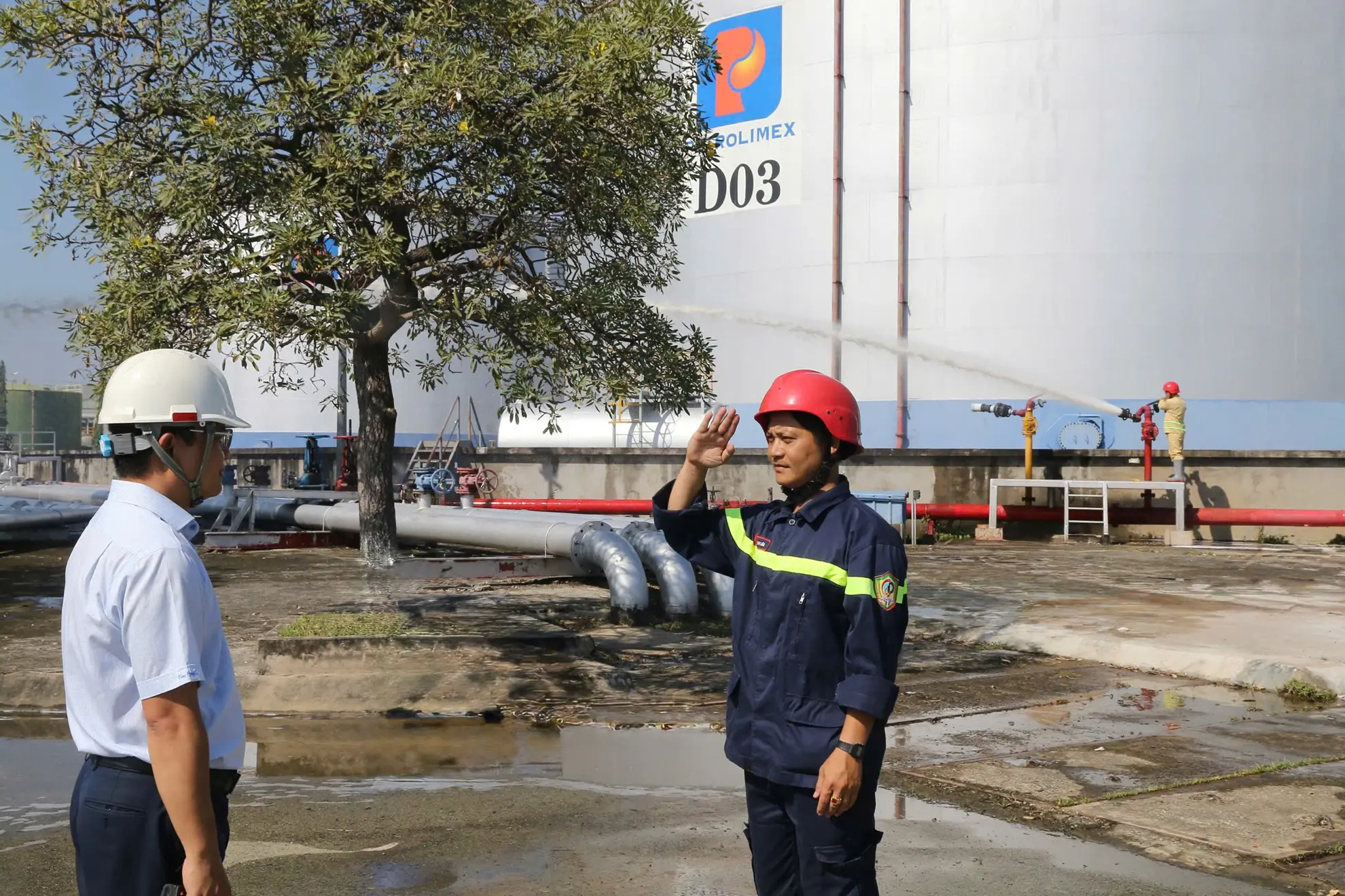 Tình huống giả định được xây dựng sát với thực tế vận hành: Trong quá trình xuất hàng, xảy ra sự cố rò rỉ xăng khi máy bơm đang hoạt động; trong lúc công nhân xử lý sự cố, do thao tác chưa đúng theo quy trình kỹ thuật đã phát sinh cháy tại khu vực nhà bơm. Đám cháy giả định có nguy cơ lan rộng, đe dọa an toàn hệ thống bồn chứa, đường ống công nghệ và các hạng mục liên quan; đồng thời phát sinh tình huống 02 người bị thương cần được cứu nạn, sơ cấp cứu kịp thời.