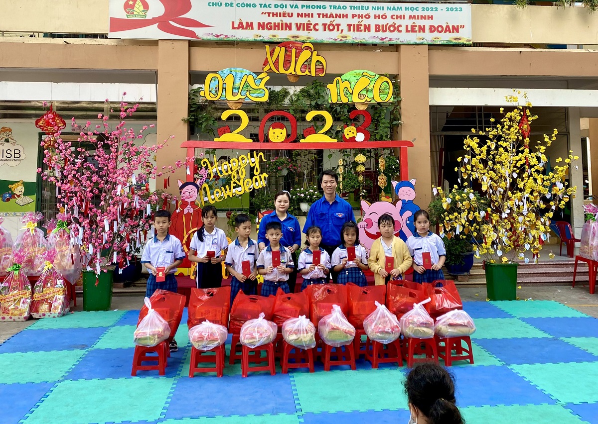 Bí thư chi đoàn TN Tổng kho Đỗ Bách Khoa (áo xanh) trao 10 phần quà cùng “Bao lì xì ấm áp” cho các em học sinh có hoàn cảnh đặc biệt khó khăn tại trường tiểu học Nguyễn Việt Hồng
