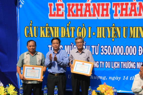 Phó Chủ tịch UBND huyện U Minh Thượng Lê Tiến Dũng tặng bằng khen cho đại diện Petrolimex Sài Gòn và Công ty KTC | Chụp hình lưu niệm tại cầu nông thôn ấp Gò 1, |