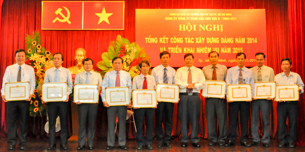 Bí thư Đảng ủy Khối DNTMTW tại TP. Hồ Chí Minh Nguyễn Văn Lịch trao các phần thưởng: Giấy khen Đảng bộ trong sạch vững mạnh tiêu biểu năm 2014 tặng Đảng bộ Petrolimex Sài Gòn