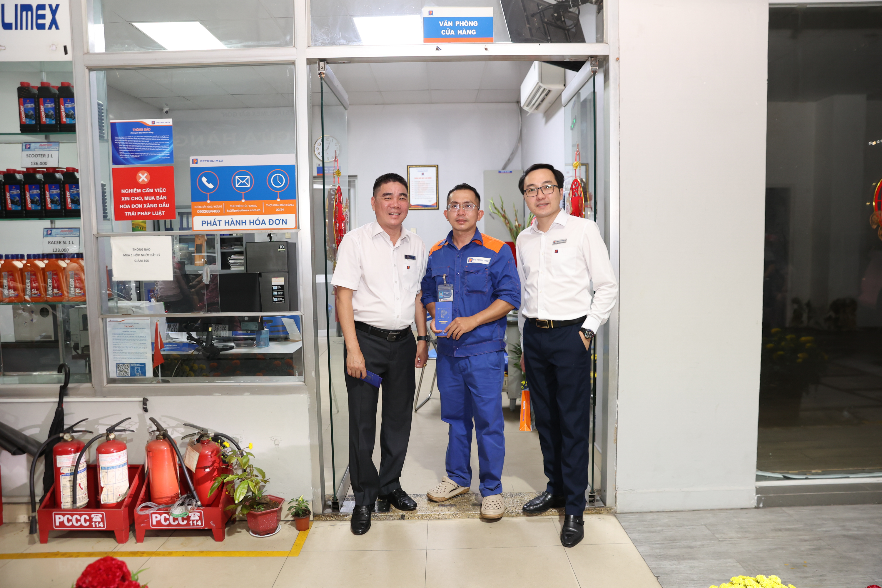 Phó giám đốc Công ty Nguyễn Thanh Hải (bìa phải) và Trưởng phòng Kinh doanh Bán lẻ Công ty Đặng Văn Hoài (bìa trái) thăm hỏi và chúc Tết người lao động tại Cửa hàng số 36 - Petrolimex Sài Gòn