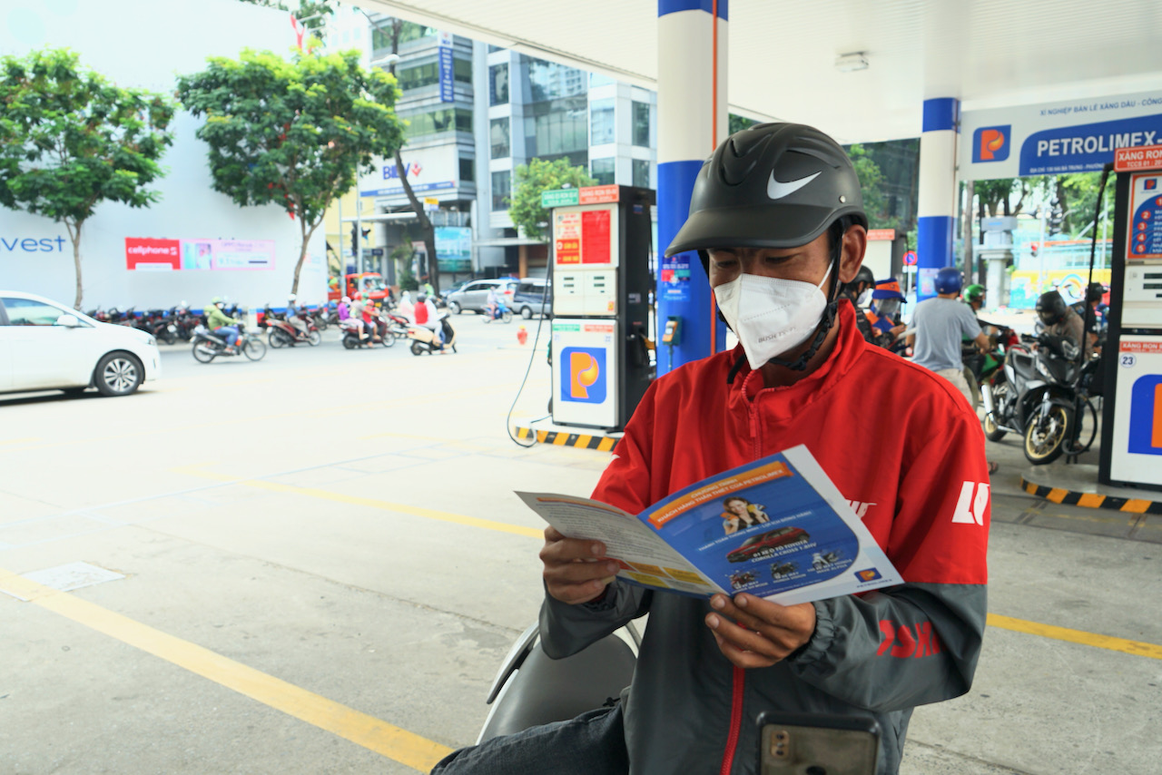 Nhân viên bán hàng giới thiệu, tư vấn về dịch vụ Thanh toán không tiền mặt và chương trình khuyến mãi tích điểm với tài khoản Petrolimex ID cho các khách hàng đến mua xăng dầu