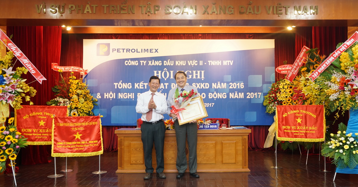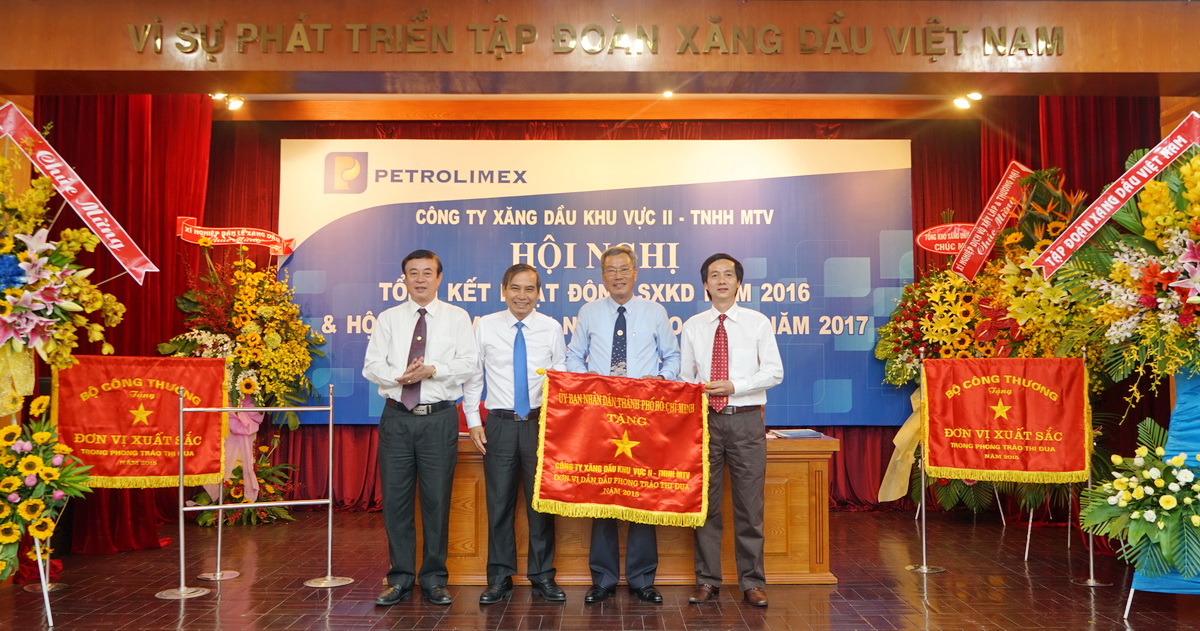Bí thư Đảng ủy Khối DNTMTW tại TP. Hồ Chí Minh Đỗ Đức Thiện trao Cờ đơn vị dẫn đầu phong trào thi đua năm 2015 của Ủy ban nhân dân TP. Hồ Chí Minh tặng CBCNV - Người lao động Petrolimex Sài Gòn