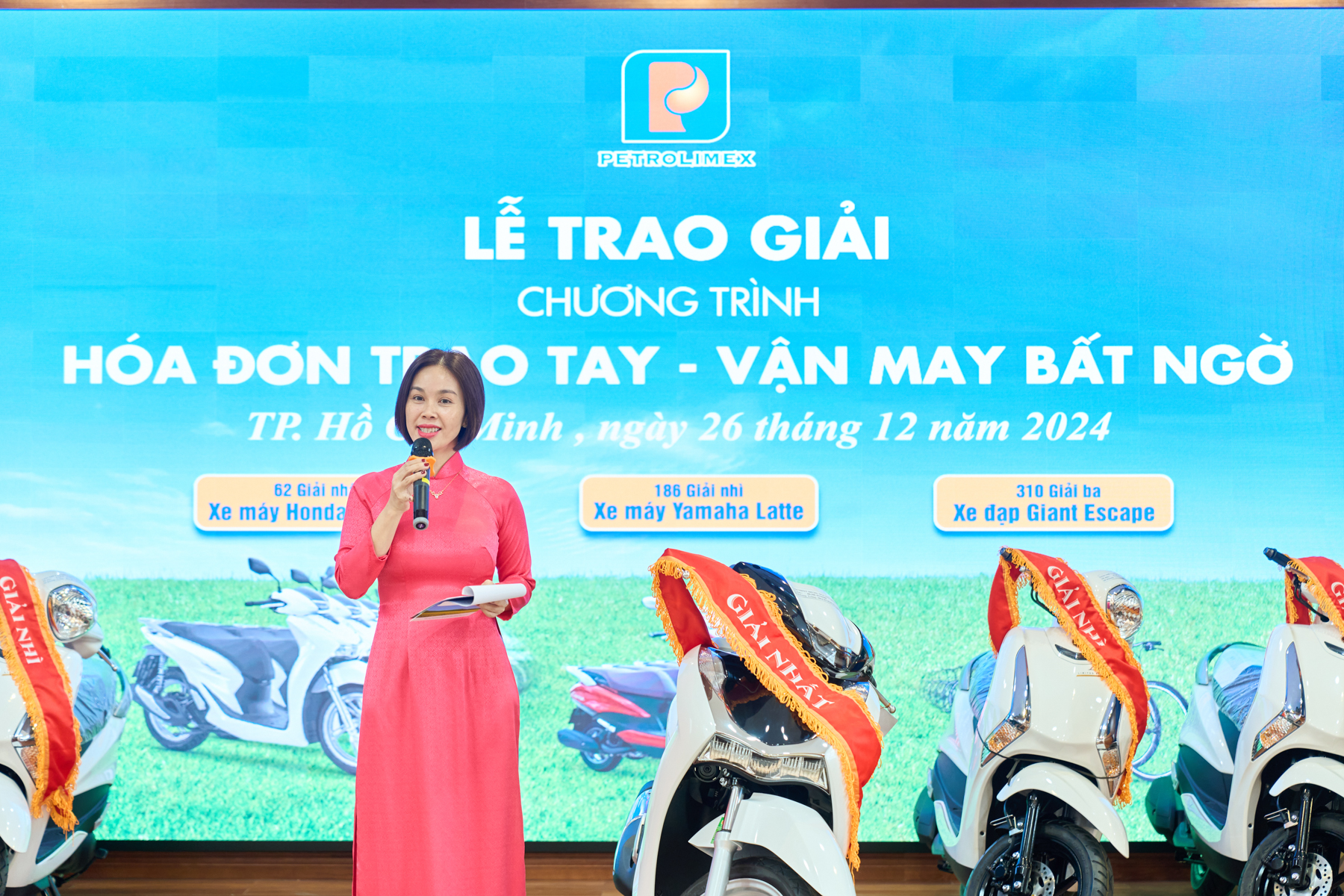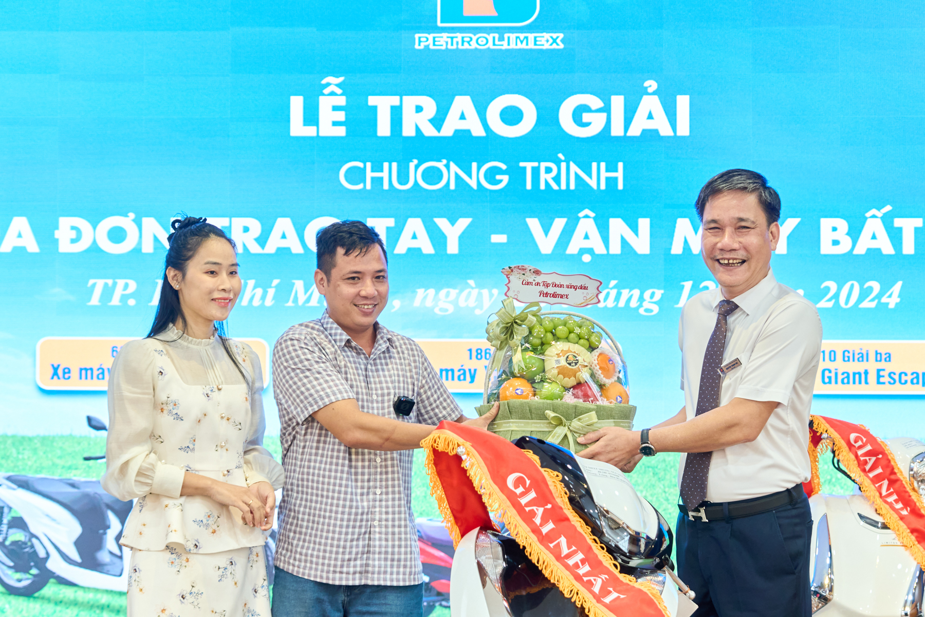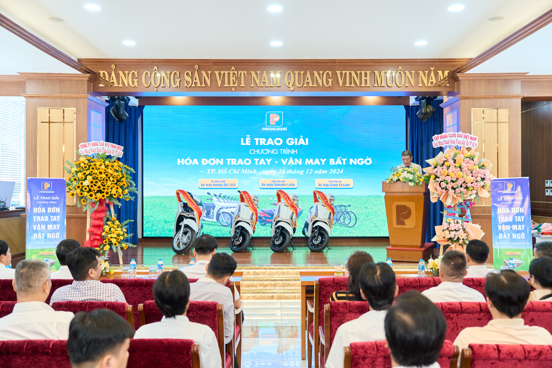Trụ sở Petrolimex Sài Gòn (15 Lê Duẩn, Phường Bến Nghé, Quận 1, TPHCM) treo banner chào đón Quý khách hàng của Petrolimex về dự Lễ trao giảiBên trong trụ sở Petrolimex Sài GònKhách hàng đến sớm làm thủ tục nhận thưởngGiám đốc Petrolimex Sài Gòn Phạm Anh Tuấn chào các Quý khách hàng đến dự buổi LễGiám đốc Chi nhánh Xăng dầu Sài Gòn Nguyễn Thanh Hải chào các Quý khách hàng đến dự buổi LễMC Hoàng Trần Dung Hạnh chào đón các Quý khách hàng về dự Lễ trao giảiGiám đốc Petrolimex Sài Gòn Phạm Anh Tuấn phát biểu tại Lễ trao giảiGiám đốc Petrolimex Sài Gòn Phạm Anh Tuấn phát biểu tại Lễ trao giảiGiám đốc Petrolimex Sài Gòn Phạm Anh Tuấn trao giải Nhất - Xe Honda SH125i đến khách hàng Phạm Đình ThưởngGiám đốc Chi nhánh Xăng dầu Sài Gòn Nguyễn Thanh Hải trao giải Nhì đến các khách hàng Võ Minh Nhật, Phan Thế Toản, Lê Huy HoàngPhó giám đốc Chi nhánh Xăng dầu Sài Gòn Đặng Văn Hoài trao giải Ba đến các khách hàng Nguyễn Đức Ánh, Tất Cẩm Giang, Hồ Văn Thông, Trần Công MinhPhó giám đốc Chi nhánh Xăng dầu Sài Gòn Trần Quốc Long trao giải May mắn đến các khách hàngAnh Phạm Đình Thưởng, khách hàng may mắn trúng giải Nhất chia sẻ cảm nghĩ tại buổi LễChị Ngô Thị Hương Phúc, vợ của Khách hàng Phạm Đình Thưởng, đến tham dự Lễ trao thưởng cùng chồng và bày tỏ niềm vui khi gia đình trúng giải Nhất của chương trìnhKhách hàng Phạm Đình Thưởng trao quà của Gia đình cảm ơn Tập đoàn Xăng dầu Việt Nam; Giám đốc Chi nhánh Xăng dầu Sài Gòn Nguyễn Thanh Hải đại diện Tập đoàn nhậnCác Quý khách hàng của Petrolimex may mắn trúng thưởng Chương trình "Hóa đơn trao tay - Vận may bất ngờ" và Lãnh đạo Công ty, Chi nhánh Xăng dầu Sài Gòn chụp hình lưu niệm tại Lễ trao giải tổ chức sáng ngày 26/12/2024 tại Trụ sở Petrolimex Sài Gòn